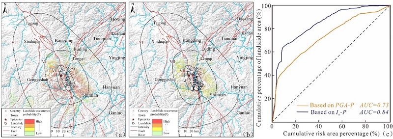 (a)基于PGA计算的同震滑坡分布概率图;(b)基于Ia计算的同震滑坡分布概率图;(c)泸定Ms6.8级地震诱发滑坡危险性成功率曲线