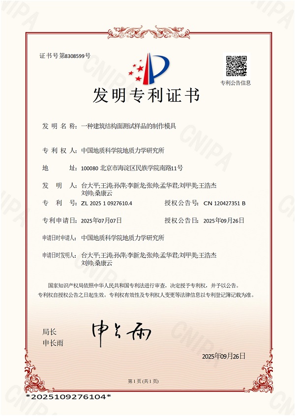 针对大型物理模型实验中张开型结构面难以成型的问题,地质力学研究所王涛研究员团队研发了一项新型建筑结构面测试样品制作模具,近日获得国家发明专利授权(专利号:ZL 2025 1 0927610.4)。本专利通过将整体模板切割为可拼接条板,并配合可倾转支撑臂和液压夹持驱动机构,实现模板的自动插入与分步拔出。该模具相比与传统模具有以下几大优势:(1)条板由第一板体和第二板体滑动拼接形成,第一板体延伸段便于夹持,分段拔出可显著减小摩擦力,避免损伤试样;(2)支撑臂在调节电机驱动下可转至与结构面一致的倾角,基座沿滑轨移动可实现多条板的快速定位插入,提高大尺寸结构面预制效率;(3)夹持部采用液压驱动,实现夹紧、插入、抽取的自动化,减少人为操作误差。该模具能够在大型振动台模型、边坡和地下结构模型中可靠制作尺寸可控的模拟裂隙,为结构面力学研究、试验重复性和工程安全评估提供重要技术支撑。
