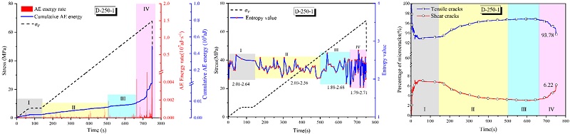 图1 声发射能量、熵值及张拉剪切信号占比图
