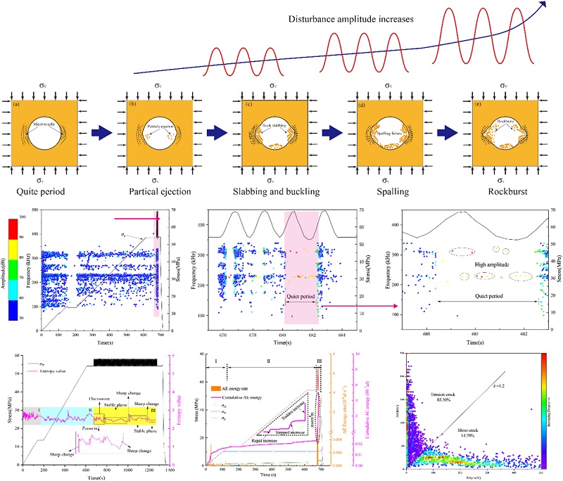 时滞型岩爆是深埋隧道工程中常见且极具威胁的地质灾害之一,尤其在高地应力环境下,时滞型岩爆的发生不仅对隧道结构构成重大安全威胁,也影响着隧道施工与长期运营的稳定性。时滞型岩爆通常发生在隧道开挖后的数小时或数周内,具有突发性、破坏性强的特点。为了深入研究扰动幅值对时滞型岩爆的影响及其诱发机制,中国地质科学院地质力学研究所王炀开展了时滞型岩爆的实验研究,采用真三轴实验模拟了不同扰动幅值下岩爆的发生过程,并结合声发射(AE)监测,探讨了扰动幅值对岩爆强度、破坏模式以及时滞型岩爆发生时间的预测方法。研究结论主要有(1)随着扰动幅值的增大,岩爆的破坏应力逐渐增大,岩爆发生的时间逐步缩短,且破坏范围显著扩大。(2)高幅值的扰动导致岩爆表现为更加剧烈的破坏,碎屑形态更为复杂。(3)AE信号分析表明,较高幅值的扰动会产生更多的低频高幅值信号,AE熵的线性增长阶段可作为岩爆发生的前兆,具有潜在的早期预警功能。