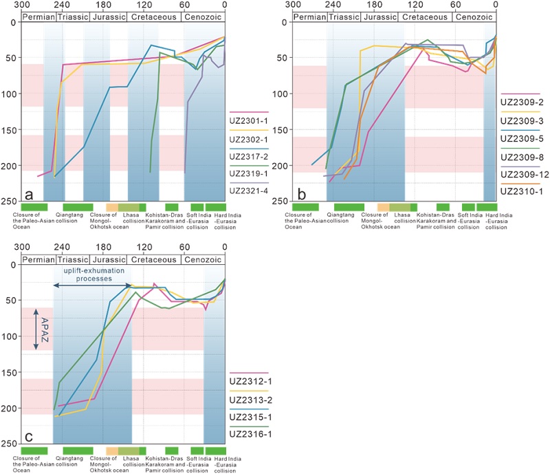 研究结果显示,克孜勒库姆-努拉塔段的AFT年龄介于 65-215 Ma,主要集中于侏罗纪,平均径迹长度较短(11-12μm),指示部分热重置现象。ZFT年龄集中于三叠纪 - 早侏罗世(180-250 Ma),ZHe平均年龄为 130-198 Ma,多套热年代学数据共同记录了区域复杂的构造-热演化历史。通过热史模拟可知,天山西段经历了中 - 新生代多期快速隆升剥露,差异隆升 - 剥露普遍存在,差异剥露模式主要受继承性地壳非均质性、缝合带再活化以及特提斯板块相互作用产生的远场应力影响。西天山整体AFT年龄呈现西北向东南逐渐年轻化的趋势,但在英吉奇克地区和乌尔根奇地区揭示了中生代构造运动从东南向西北扩展的规律。研究确立三期主要构造 - 热演化阶段,分别为三叠纪快速剥露、侏罗纪-早白垩世隆升以及晚白垩世-新生代埋藏-复活旋回,三期构造演化的主要动力均来源于天山南部特提斯构造域板块运动的远程效应。本研究填补了天山最西段中-新生代隆升剥露过程研究的关键空白,为整个造山带的构造演化提供了更完善的约束模型。