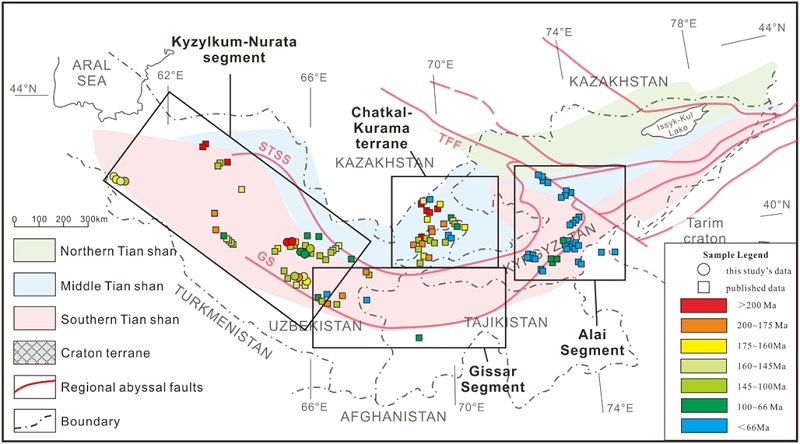 天山造山带横亘亚洲大陆中部,绵延约 2500 公里,跨越中国、乌兹别克斯坦等多个国家。在古生代大陆边缘增生-碰撞造山基础上,天山造山带中-新生代受南、北缘多期板块碰撞的远场效应影响,引发了强烈的隆升剥露,是研究中亚内陆造山过程与机制的天然实验室。现有研究多集中于天山中部和东段(吉尔吉斯斯坦天山及中国境内塔拉兹-费尔干纳断裂以东区域),对西段中-新生代差异隆升剥露过程及其动力学机制的研究相对薄弱,制约了对整个天山造山带构造动力学的全面理解。