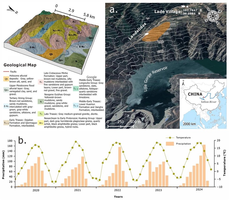 气候/季节变化环境诱发的库区滑坡级联灾害具备复杂非线性交互响应。“气候/季节变化-土体流变-植被反馈-涌浪风险”级联效应为大型水库长期安全风险,但典型水库区滑坡级联效应如何传导以及关键传导环节特征如何表现?研究基于地表形变、生态反馈等多向视角,通过对非均质地质体、地表植被与时空滞后效应解析的相结合,对黄河上游李家峡水库区李坎滑坡开展实证分析,发现坡体正经历持续变形,并以渐进模式向水库运动。近5年之中,2020年1月、2024年5月和2024年12月显著加速(冬、春季),是重要活动时间窗口,整体呈准刚性块体北向偏转运动趋势。水平位移异常区面积0.7 km²,平均厚度10.6 m,体积6.5×10⁶ m³,位移速率高达50-73 mm/yr;下滑异常区面积0.3 km²,平均厚度7.9 m,体积2.4×10⁶ m³,速率最高22-33mm/yr;坡体流变系数(f)对厚度反演影响显著,低f值时坡体厚度较大,流变增强时厚度增加,钻孔验证显示f=0.7至1.0时反演厚度与实际厚度最为接近,滑坡体也更接近于刚性块体;既存在水平快速位移,又存在迅速下滑迹象的面积为2.2×10⁻² km²,平均厚度7.03 m(最大厚度22 m),因其朝着库区方向表现出高活跃,可能成为坠入水库的滑源体并造成涌浪(按入水坡体厚7m计,估计结果<1 m;入水坡体厚22 m,估计结果<3.4 m),存在安全风险。水平位移异常滑动区与植被衰退存在强相关,滑坡发生后部分植被逐步恢复。就滑坡活动外部因素而言,降水发挥关键作用,但存在滞后效应,整体滞后时间约3-6个月,而粉砂质成分、岩层排列与坡面方向的一致性以及局部的应力不均是降水因素得以发挥作用的物理基础。研究建立了多场耦合分析-风险预警决策框架,为认识气候变化下滑坡响应提供了实证案例。