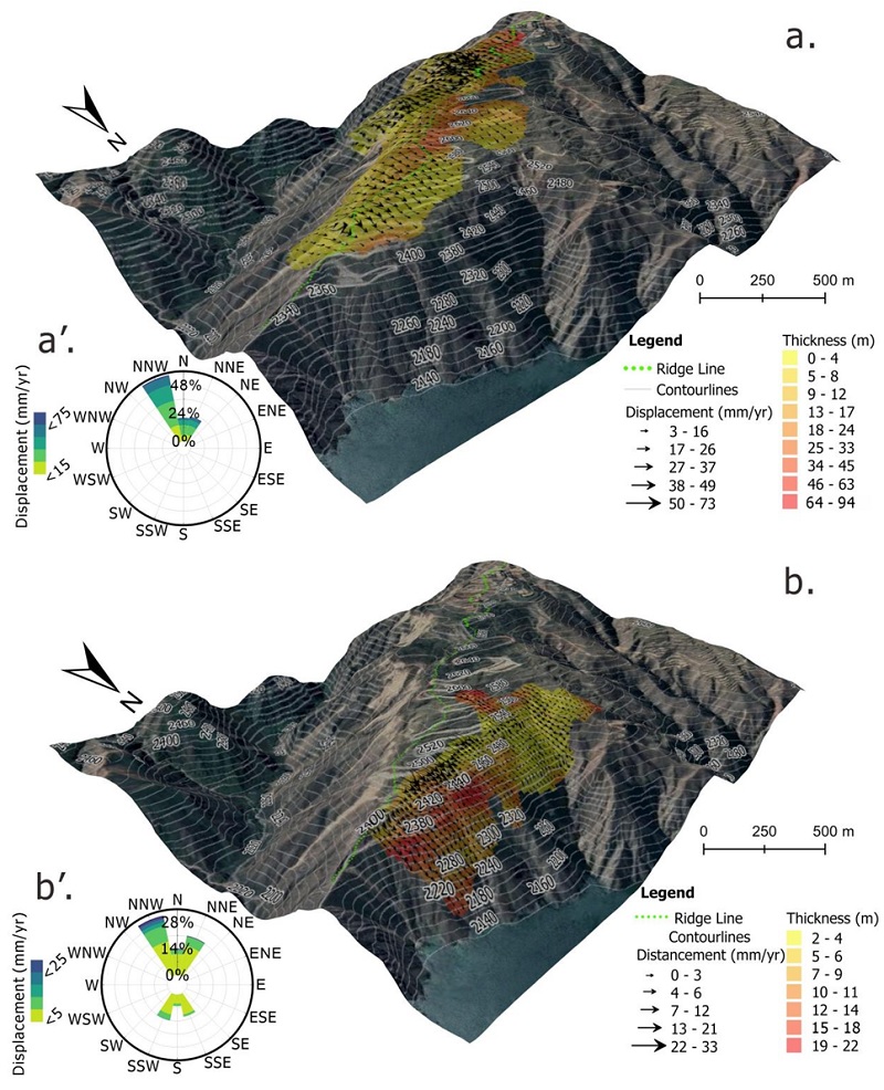 图5 滑坡体的厚度及位移定量特征:a, 水平位移异常区的厚度及其运动方向;a’, 水平位移速率异常区像元速率及方向统计特征;b, 垂向位移速率异常区的坡体厚度及其运动方向;b’, 垂向位移速率异常区像元速率及方向的统计特征。
