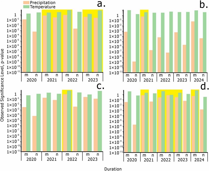 图6 2020-2024年滑坡体累积变形量与降水量、地表温度相关性的显著性水平在不同时间段的变化:a,升轨观测条件下水平活动异常区;b,降轨观测条件下水平活动异常区;c,升轨观测条件下垂向活动异常区;d,降轨观测条件下垂向活动异常区(注:这张图展现了以滑坡体的累积变形量为因变量,累积降水量和累积温度为自变量的二元一次线性拟合方程中自变量的显著性水平p值,p值越小,表示因素作用越显著;因基于四季时间尺度构建的线性拟合方程无法经过拟合优度检验,故调整为干、湿两季时间尺度,即m为每年的5-10月;n为11月至次年4月;黄色背景表示基于该时间段气候数据所构建的线性方程的拟合优度未通过阈值Rα=0.05检验)。