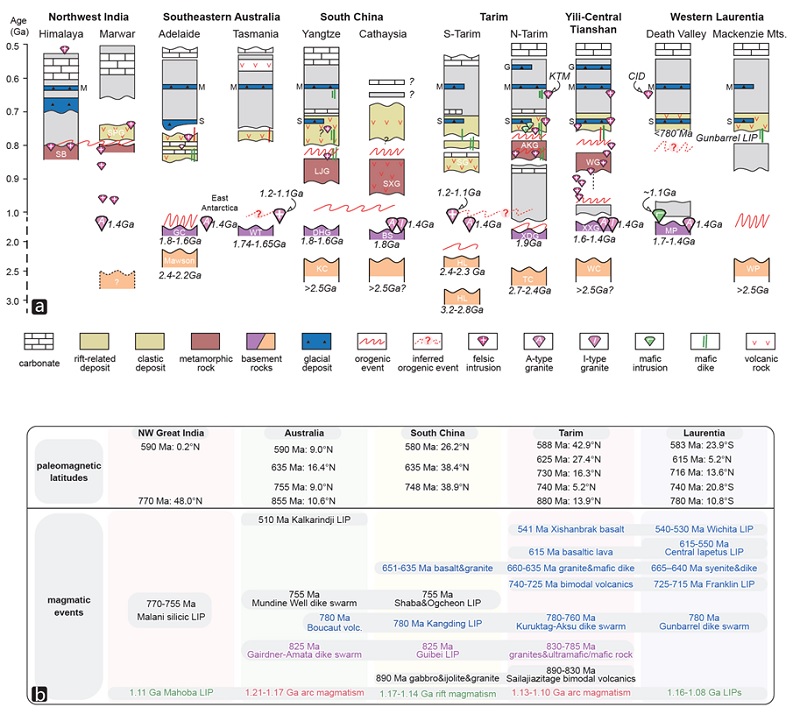 新元古代(~10-5.4亿年前)是地球在其地质历史演化进程中的一个重要转折阶段。该时期一个全球性的超级大陆——罗迪尼亚超大陆——逐步拼合形成,随后又逐渐分崩瓦解。这一地质过程深刻地改变了地球岩石圈的板块构造格局,也为随后适宜生命生存的自然环境形成提供了奠基。数十年来,地质学家们努力通过地质证据和古地磁等手段开展联合约束,使得世界上多数大型克拉通在罗迪尼亚超大陆的重建位置已得到较为妥善的配置。但是,诸如亚洲等地区的众多小型克拉通的古地理位置仍不明确。