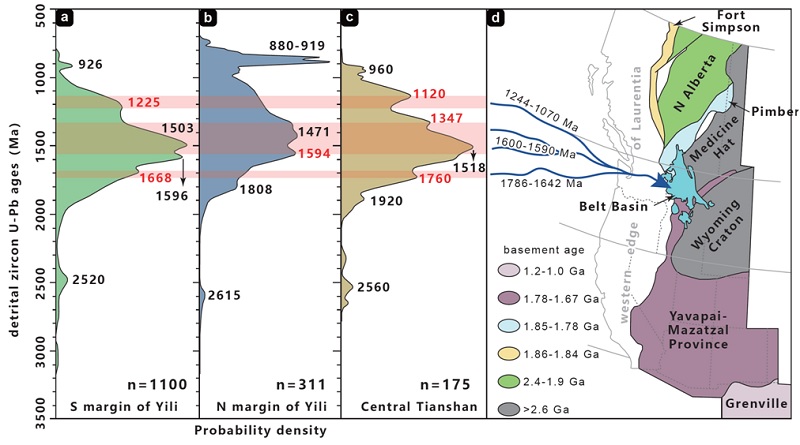 最新研究成果表明,中天山地块和伊犁地块被认为是中—新元古代塔里木克拉通北部的重要组成块体,共同构成了经典的威尔逊构造旋回。将该“大塔里木”地块的构想与北美劳伦大陆西部的关键地质特征进行系统对比后发现,两者兼有高度相似的岩浆活动序列和构造过程脉络(图2)。这些相似地质过程包括:(1)塔里木北缘~780–760 Ma的基性岩墙群与劳伦西部~780 Ma的“Gunbarrel”大火成岩省属于同阶段的裂谷产物(图3);(2)地幔柱驱动的大陆裂谷事件及共轭大陆边缘盆地在塔里木克拉通和劳伦西部近同步发育(图2);(3)中天山陆块的中元古代花岗岩带可与劳伦南部~1.4 Ga的花岗岩—流纹岩带进行年代学和同位素对比(图2);(4)“大塔里木”地块的中元古代盆地与劳伦西部具有可对比的源汇系统(图4);(5)约650–615 Ma的同期岩浆活动与大陆裂谷到大陆漂移的构造转换共同导致了“大塔里木”和劳伦的被动大陆边缘形成(图3)。