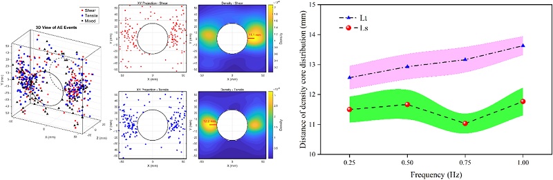 在深埋隧道工程中,爆破施工、机械开挖及周期性扰动不可避免地对围岩施加动态作用,其中扰动频率是影响围岩损伤演化和岩爆触发过程的重要动力学参数。尤其在高地应力环境下,长期或高频扰动可能加速围岩能量积累与释放过程,诱发突发性岩爆失稳,对隧道施工安全和结构稳定构成严重威胁。然而,扰动频率对岩爆失稳行为及其动力学机制的影响仍缺乏系统的实验认识。针对上述问题,中国地质科学院地质力学研究所王炀开展了不同扰动频率条件下深埋隧道围岩岩爆实验研究。通过在高应力环境下施加不同频率的周期性扰动荷载,系统再现了围岩在持续扰动作用下的损伤累积、能量演化及岩爆失稳全过程,并结合高速摄影及微观结构分析等手段,揭示了扰动频率对岩爆动力学行为的控制作用。研究结果表明:(1)在扰动幅值相近的条件下,扰动频率对岩爆失稳时序和破坏模式具有显著调控作用。随着扰动频率的提高,围岩内部能量释放速率明显加快,岩爆发生时间提前,破坏过程由渐进式损伤累积向快速失稳转变。(2)声发射监测结果显示,高频扰动条件下声发射事件活动更加密集,能量释放更为集中,反映了裂隙快速扩展和协同贯通的动力学特征。(3)碎屑特征及微观结构分析表明,提高扰动频率会加速围岩内部孔隙演化和结构弱化过程,使应力状态更早与削弱后的强度条件相交,从而诱发岩爆失稳。