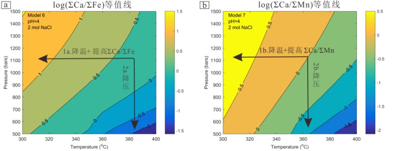 ΣCa, ΣFe, ΣMn 分别代表白钨矿、钨铁矿、钨锰矿在热液中的溶解度。等值线的0值代表白钨矿与钨铁矿(或钨锰矿)的溶解度相等。当热液中(或)高于等值线,热液将沉淀出白钨矿;当热液中(或)低于等值线,热液将沉淀出钨铁矿(或钨锰矿)。图中箭头指示了白钨矿交代钨铁矿或钨锰矿的两种机制。