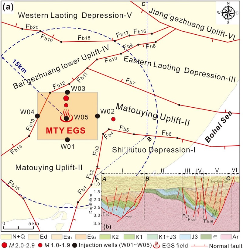 唐山地区是华北最为典型的强震区之一,区域内分布唐山断裂带、昌黎-宁河断裂、滦县-乐亭断裂等规模性的发震断裂(图1),此外,马头营凸起区及周围还分布多条次级构造单位的边界断层(图2)。国外干热岩开发案例表明,干热岩区深部储层注水压裂往往会诱发近场断层失稳发生中小地震。中国地质科学院地质力学研究所丰成君博士联合瑞士苏黎世联邦理工学院的张诗淮博士和马晓冬博士等,基于断层滑动失稳风险定量评价方法,综合考虑干热岩区地壳浅层地应力场和注水引起的孔隙水压扰动影响,系统探讨了马头营干热区假定的注水井深部注水对干热岩区近、远场主要隐伏断层构造稳定性的影响,并估算了可能诱发的最大地震震级。