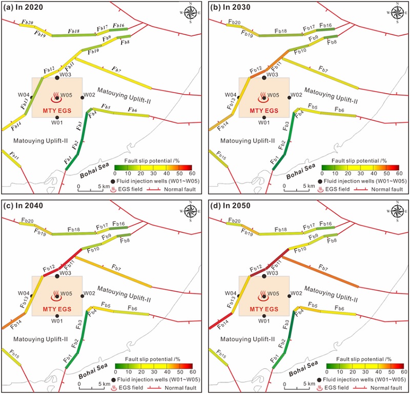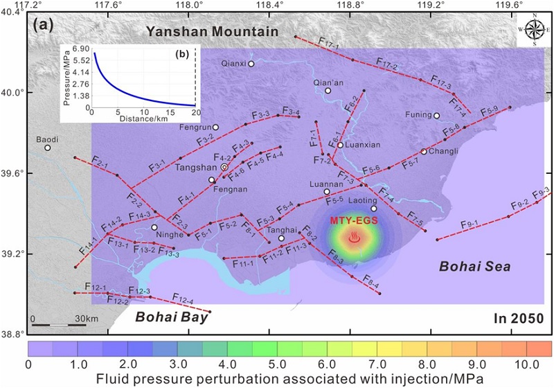 研究结果表明:(1)在51升/秒的注水条件下,马头营干热区4个假定注水井持续注水30年在35米储层深度(3965-4000米)内产生的孔隙水压力扰动一般不超过12兆帕,该孔隙水压力扰动对距离注水井15千米范围的断层有影响,而对该距离范围之外的断层影响不明显(图3)。(2)在距离注水井10千米深度范围内,随着注水时间持续延长,马头营干热岩区内多条次隐伏断层滑动失稳概率增大,注水至2050年,柏各庄低凸起和马头营凸起的边界断层滑动失稳概率高达60%(图4)。(3)当月注水量不超过31.1万立方米时,流体损失率为40%的情况下,马头营干热区近场断层失稳可能诱发的最大地震不超过4.7级。(图5)