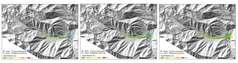 调查研究表明:极端降雨诱发的冰湖堰塞坝溃决、源头滑坡堵塞沟谷、山洪等灾害是错玖沟泥石流启动的主要形式。极端工况的计算分析显示50年一遇、100年一遇的工况下,泥石流在线路工程附近的堆积高度分别为21.1米、25.7米。实时监测上游地质环境变化是控制灾害风险的有效方式。