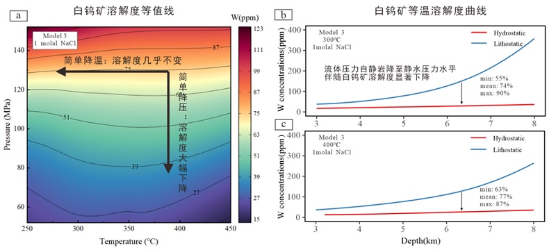白钨矿是两种最主要钨矿石矿物之一,常产在矽卡岩型钨矿和许多脉型钨矿中,也是斑岩型钼钨矿、造山型金矿中的重要矿石矿物。形成白钨矿的热液流体常含CO2,但白钨矿在这种流体的沉淀机制却缺乏系统研究。另一个有趣的现象是,国内外许多白钨矿床产在距离成矿母岩较远或缺少花岗岩的地区。为服务于新一轮找矿突破战略行动,中国地质科学院地质力学研究所与中国地质大学(武汉)联合培养硕士研究生刘昊在刘向冲研究员的指导下,完成白钨矿黑钨矿在NaCl–H2O–CO2体系的热力学理论计算,取得以下新认识(Liu et al. 2024):