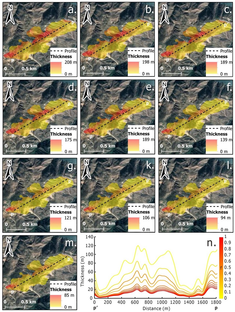 图3 水平位移速率异常区在f为不同数值条件下的反演厚度(注:a, f=0.1时的滑坡厚度;b, f=0.2时的滑坡厚度;c, f=0.3时的滑坡厚度;d, f=0.4时的滑坡厚度;e, f=0.5时的滑坡厚度;f, f=0.6时的滑坡厚度;g, f=0.7时的滑坡厚度;h, f=0.8时的滑坡厚度;i, f=0.9时的滑坡厚度;m, f=1时的滑坡厚度;n, 滑坡厚度随f的变化剖面。)
