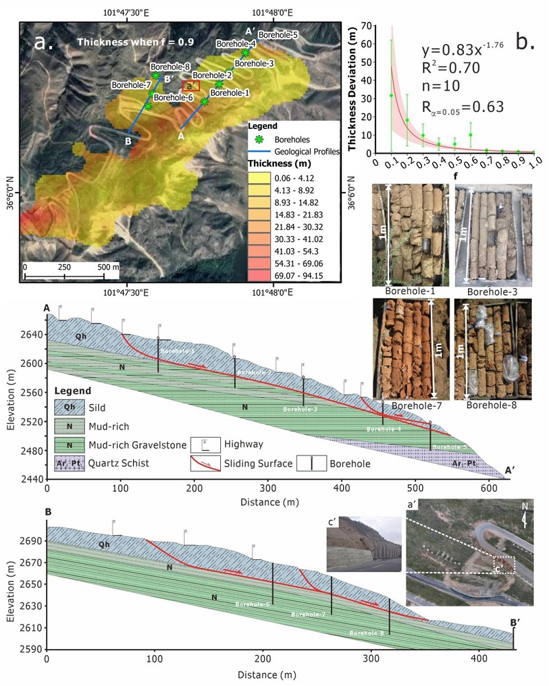 图4 滑坡厚度反演过程中的适宜性f值选取的钻孔验证与野外调查(注:f=0.9时的滑坡厚度;b,钻孔反映的滑动面深度与反演厚度之间的偏差随f的变化;a’,局部强烈变形区的正射影像;c’,断裂的挡土墙;A-A’,B-B’为变形活跃区的地层剖面,产状特征20°-30°,∠10°-20°)