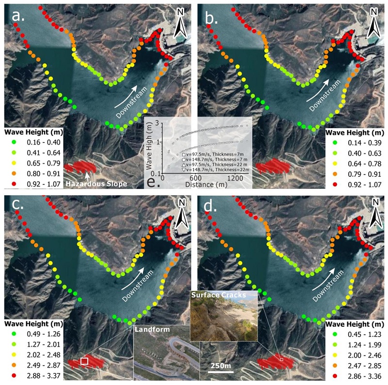 图7 高危险体坠入库区后可能造成的涌浪特征(注:根据能量守恒定律以及莫尔-库仑屈服准则,滑坡体入水速度v可以通过公式"v=" √("2gH(1-" "cot" "α" "tan" "φ" "-" "cS" /("mg" "sin" "α" ) ")" )进行估算,最早由Noda推导出的;另外,根据Fritz提出的方法,"v=" √("2gH(1-fcosα)" ),且"log" "f" "=-0.15666" "log" 〖"V" _"s" 〗 "+0.62419" (其中,α=31°为坡面倾角;距离水面高度H=330 m;m为滑体质量1.61×10³-1.8×10³kg/m³;危险体面积S=2.2×10⁴ m²;φ为内摩擦角;c为粘聚力;f为等效摩擦角°;"V" _"s" 为岩土体体积(m³);g=9.8 m/s²;V_s为岩土体体积(m³)))。