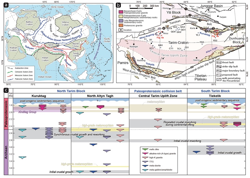图1 (a)欧亚大陆主要克拉通和造山带分布;(b)塔里木克拉通前寒武纪地层和岩浆岩分布;(c)塔里木克拉通太古宙-古元古代早期岩浆和变质事件记录