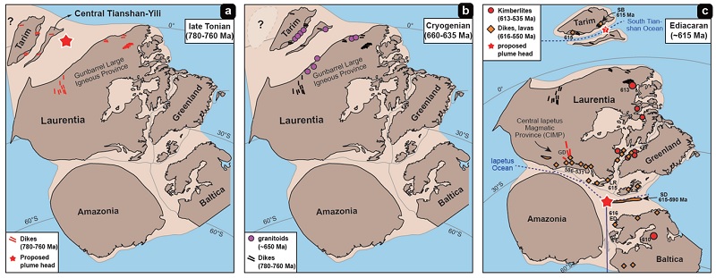 图3 (a)拉伸纪晚期(780–760 Ma),(b)成冰纪晚期(660–635 Ma)和(c)埃迪卡拉纪早期(~615 Ma)劳伦大陆西侧古地理重建方案