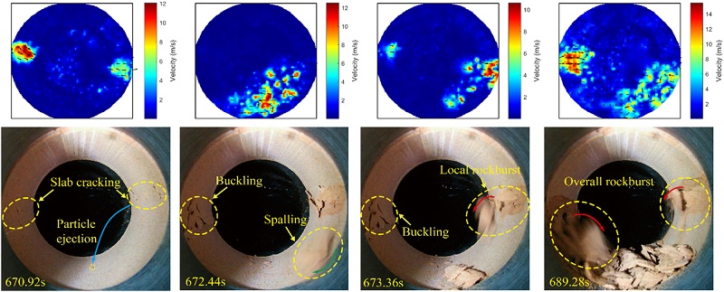 图2岩爆演化过程及速度场特征