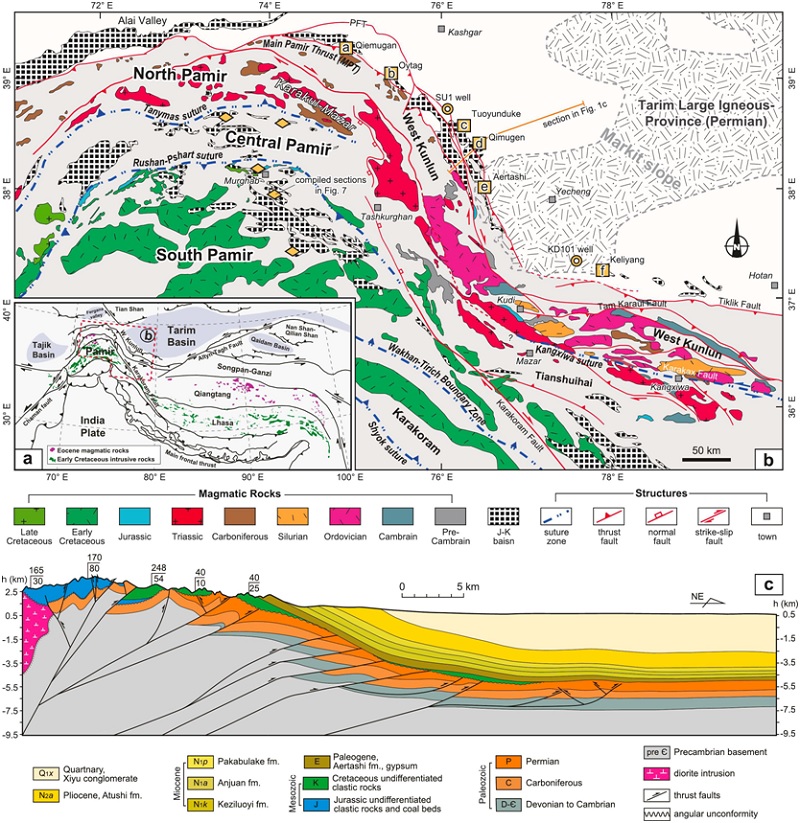 图1 (a)青藏高原—帕米尔高原与中亚盆地群的大地构造位置;(b)帕米尔高原和塔里木盆地西南部岩浆岩和中生界分布;(c)西昆仑造山带和塔里木西南盆地构造结合带地质剖面结构