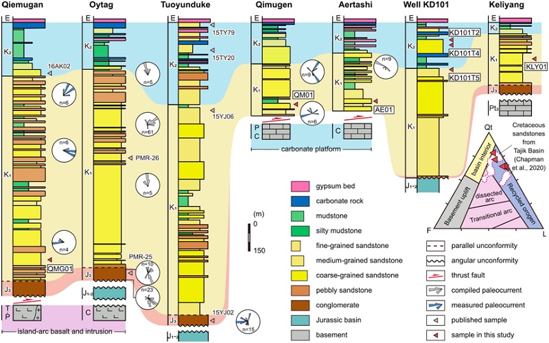 图2塔里木盆地西部白垩纪地层实测地层剖面对比,显示地层厚度、岩性、古流向及采样层位