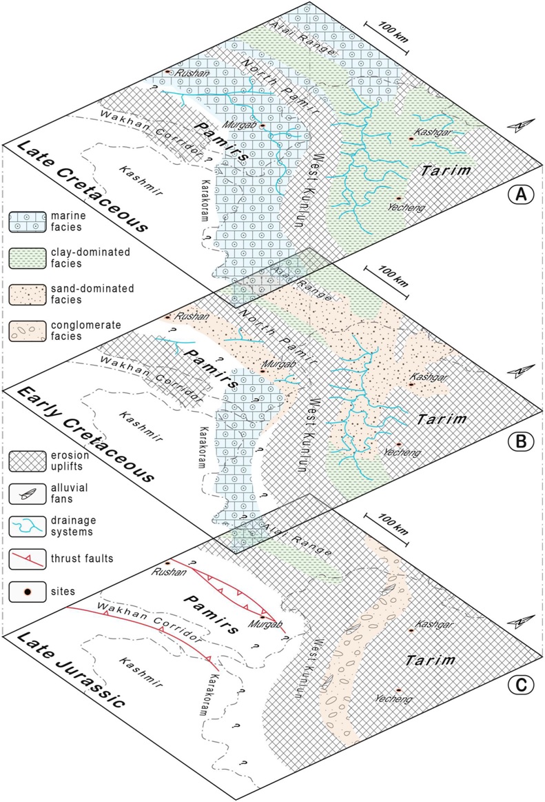 与塔里木西部不同,位于中帕米尔与南帕米尔内部的残留盆地,沉积了大量来自于就近陆缘弧带的白垩纪中期火成岩碎屑。热年代学数据记录了北帕米尔地区晚侏罗世至早白垩世的变质作用与隆升过程,表明当时在北帕米尔一带存在地形高地,是阻碍帕米尔内部和北侧塔里木盆地流域间沉积物交换的主要地理屏障。