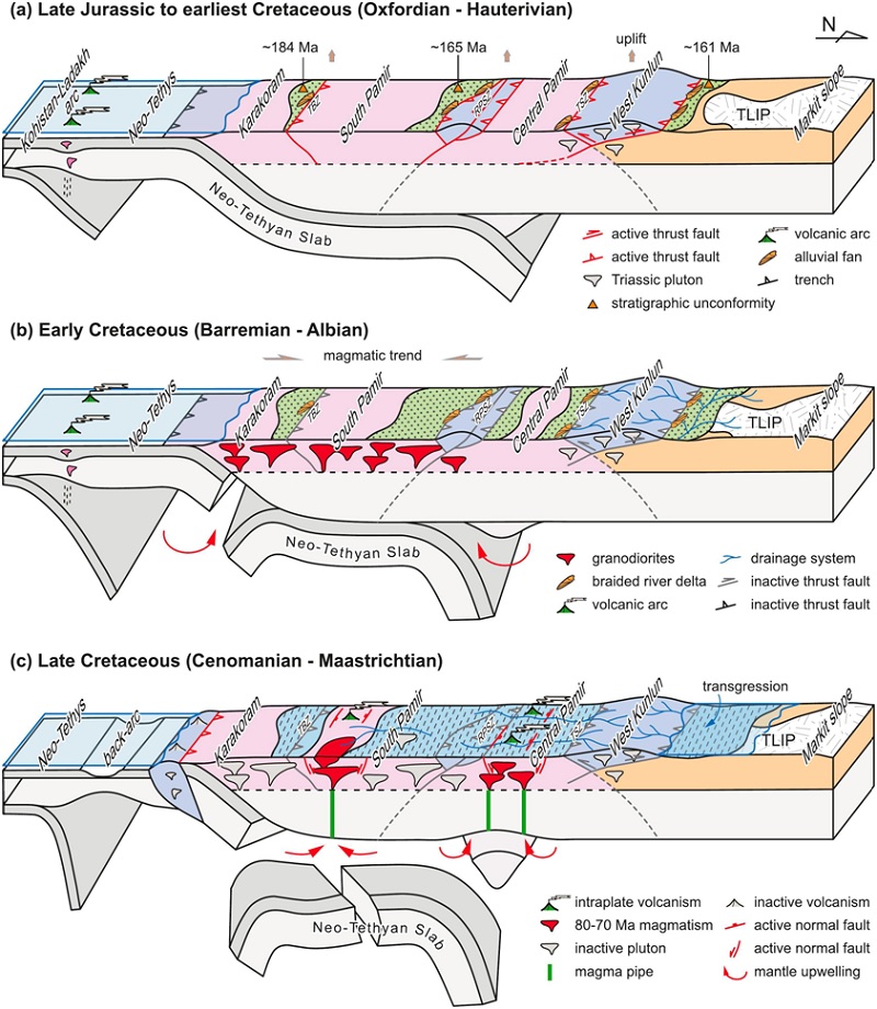 本研究将盆山古地理重建与区域岩浆活动记录相结合,提出晚侏罗世至早白垩世初期,新特提斯洋平板俯冲的向北推进引发俯冲带上盘大陆的构造挤压,进而驱动了帕米尔地区地壳变形。南帕米尔地区白垩纪中期发育了大规模的强烈岩浆活动,并伴随中亚区域上广泛的海侵事件,这些现象被解释为新特提斯洋板块俯冲后撤或拆沉过程中地壳伸展的产物。新特提斯洋沿亚洲南缘的持续向北俯冲,从根本上重塑了大陆地壳的构造格局与物质组成,为新生代印度—亚洲碰撞的远程构造响应及广阔高原的向北扩展奠定了重要的架构基础。