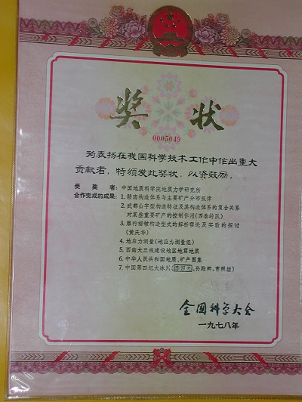 1978年,地质力学所地应力测量、西南大三线建设地区地震地质等项目,在全国科学大会上获奖