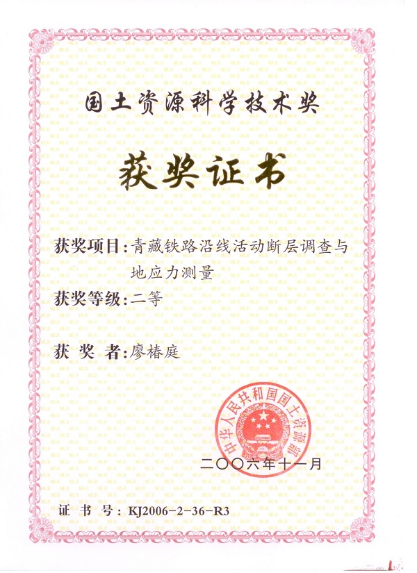 《青藏铁路沿线活动断层调查与地应力测量》项目获2006年国土资源科学技术二等奖