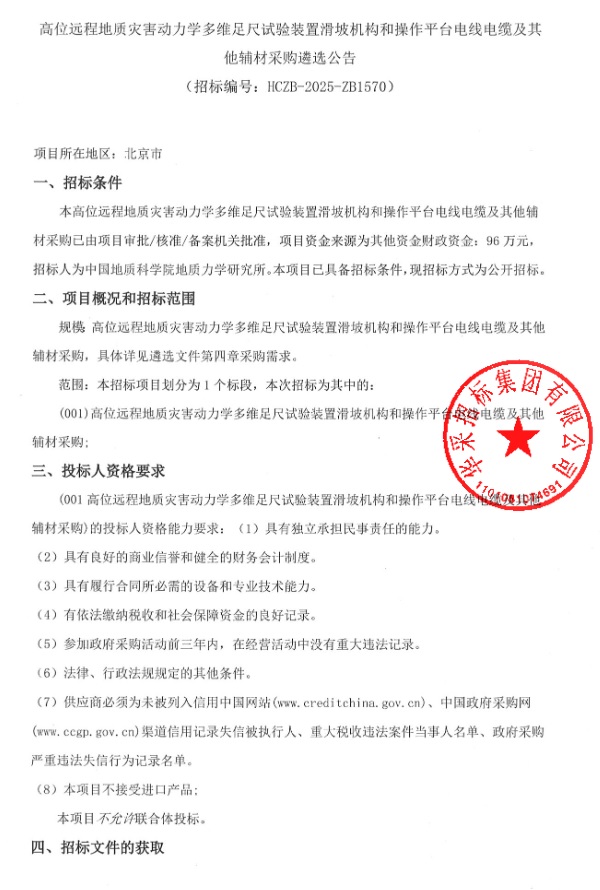 高位远程地质灾害动力学多维足尺试验装置滑坡机构和操作平台电线电缆及其他辅材采购遴选公告