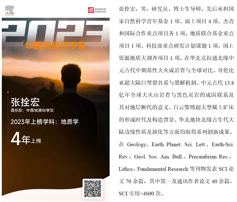 据悉,2023“中国高被引学者”共计上榜5801人,来自全国496所高校、科研机构及企业,涵盖了教育部10个学科领域、84个一级学科,其中地质学上榜103人。该榜单以全球权威的引文与索引数据库Scopus作为科研成果的统计来源,从多个维度深度剖析,系统性展示学者的科研成果,受到国内外众多媒体和学者的高度关注。