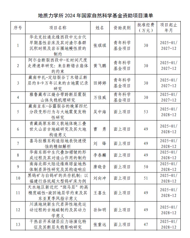 8月23日,国家自然科学基金2024年集中接收申请项目评审结果公布,地质力学所获批基金项目13项,包括青年科学基金项目4项、面上项目9项,获资助经费566万元。在今年基金申报竞争激烈的情况下,我所基金申报获批数量、经费额度均保持了稳中有进的良好势头。