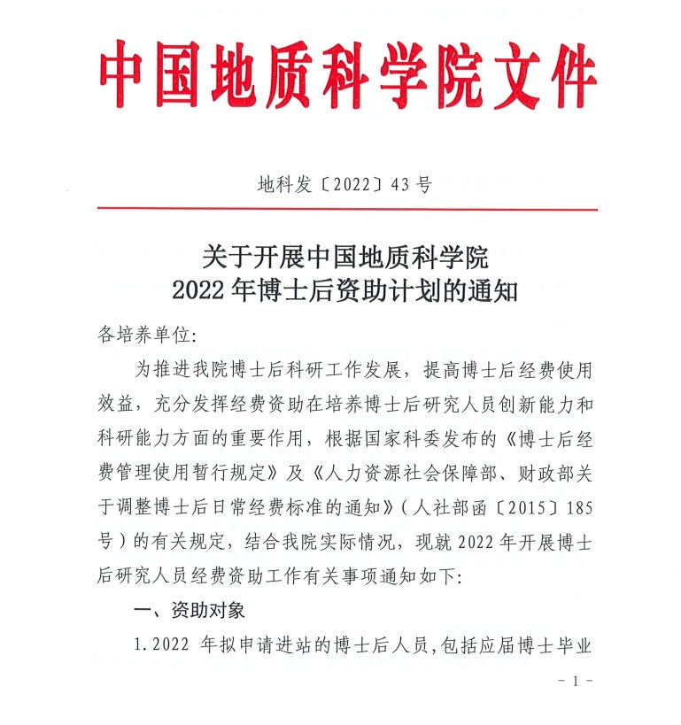 地科发〔2022〕43号-关于开展中国地质科学院2022年博士后资助计划的通知