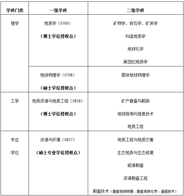 现有2个一级学科博士学位授权点(地质学、地质资源与地质工程),1个一级学科硕士学位授权点(固体地球物理学),7个博士学位专业,6个硕士学位专业;设有地质学和地质资源与地质工程2个博士后科研流动站。现有博士生导师24人,硕士生导师58人。