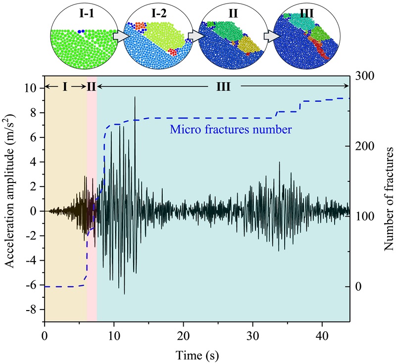 震裂边坡的动力学行为受结构面的显著控制,现有研究多聚焦于贯通型结构面的作用,而对具有关键控制作用的非贯通结构面关注不足。本研究基于大型振动台试验与离散元数值模拟,揭示了非贯通结构面对边坡地震响应与渐进性破坏过程的影响。研究结果表明:(1)受结构面控制,边坡的高地震响应区由坡顶向结构面开口附近转移,形成沿坡面分布的“高响应带”,该区域与最终破坏区高度重合,表明其为潜在失稳触发区。(2)边坡地震响应具有明显的非线性特征,随着地震动强度增加,材料剪切模量降低、阻尼比增大,能量吸收增强,整体响应反而减弱;同时坡面水平加速度放大系数随坡高增加而增大,中上部坡体出现显著放大。(3)边坡破坏呈现三阶段渐进性特征:地震初期,坡肩结构面开口处首先发生拉伸裂缝,形成局部解体;中期裂缝贯穿并与结构面连接形成主滑动面,引发整体失稳;后期裂缝继续向坡脚扩展,形成次滑动面,控制最终破坏范围。研究指出,震裂边坡地震风险评估中应重点关注非贯通结构面引起的高响应区偏移及裂缝演化特征,以提升对边坡失稳机制与灾害规模的预测精度。