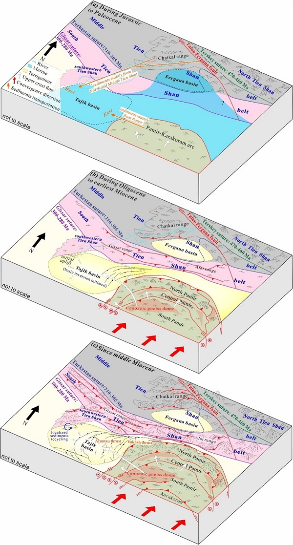 图3塔吉克盆地-帕米尔-天山地区中-新生代构造演化图